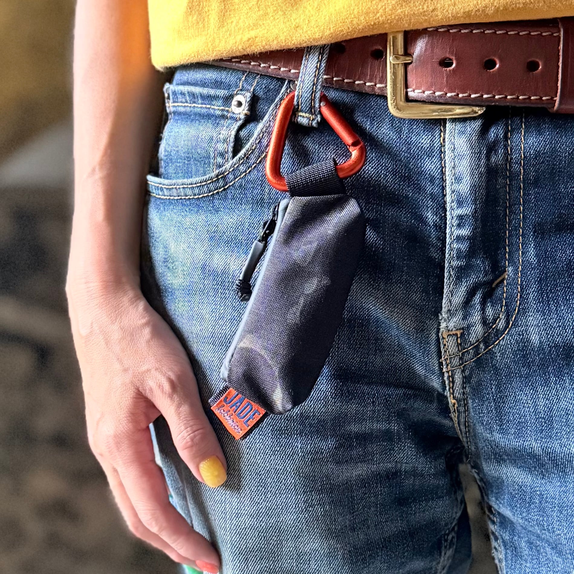 お手持ちのカラビナでベルトループやバックパックのモールにつけることができます。
